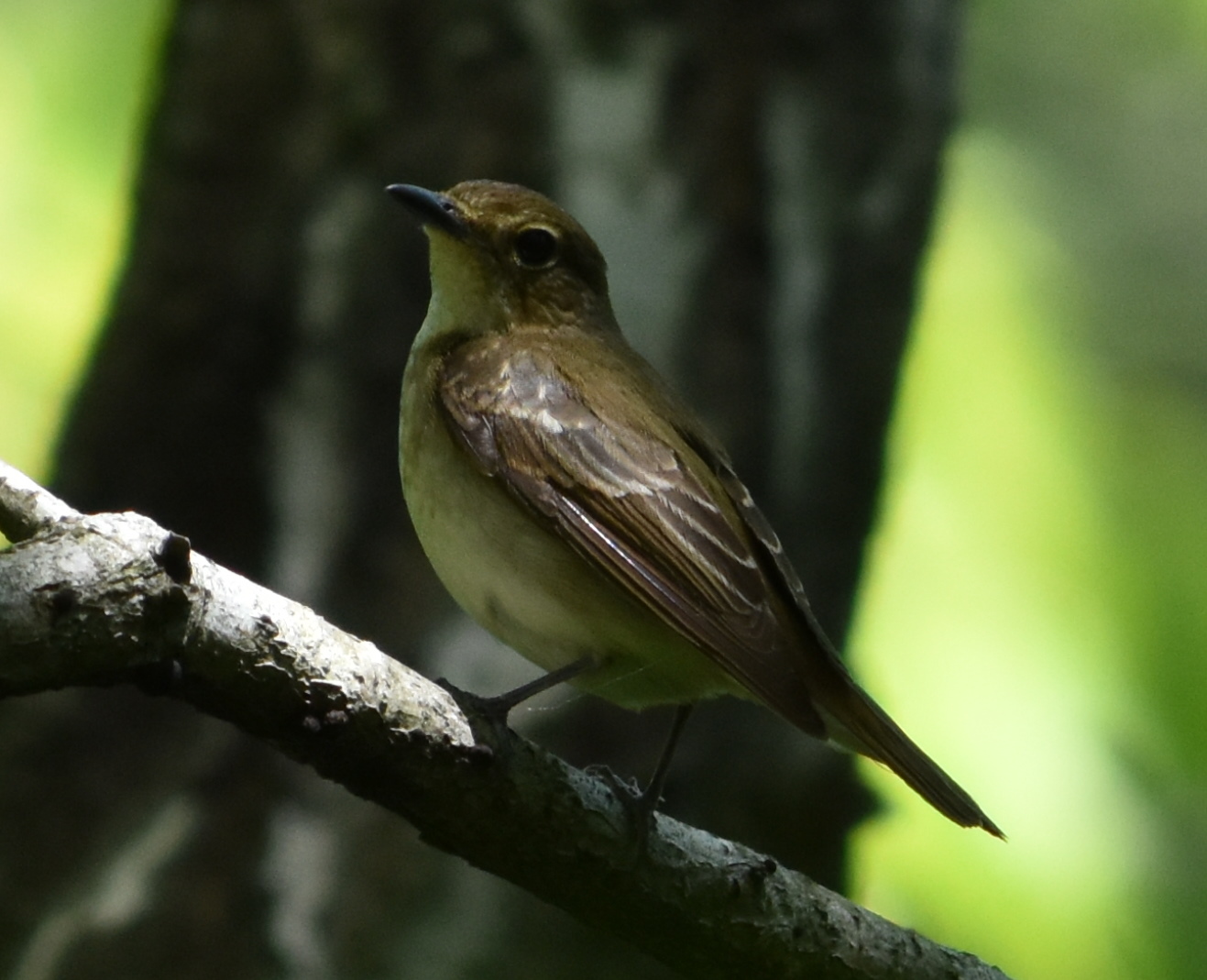 香りの道でオオルリらしき声がするので、近づきその方向を見ていると、前方1.5メートルくらいのところにビタキ系と思われる鳥が飛んできて止まりました。カメラを構えるまもなく、飛び立ってしまいましたが、それでも撮影可能なところにいてくれました。図鑑で調べると、おそらくキビタキの幼鳥のようです。
